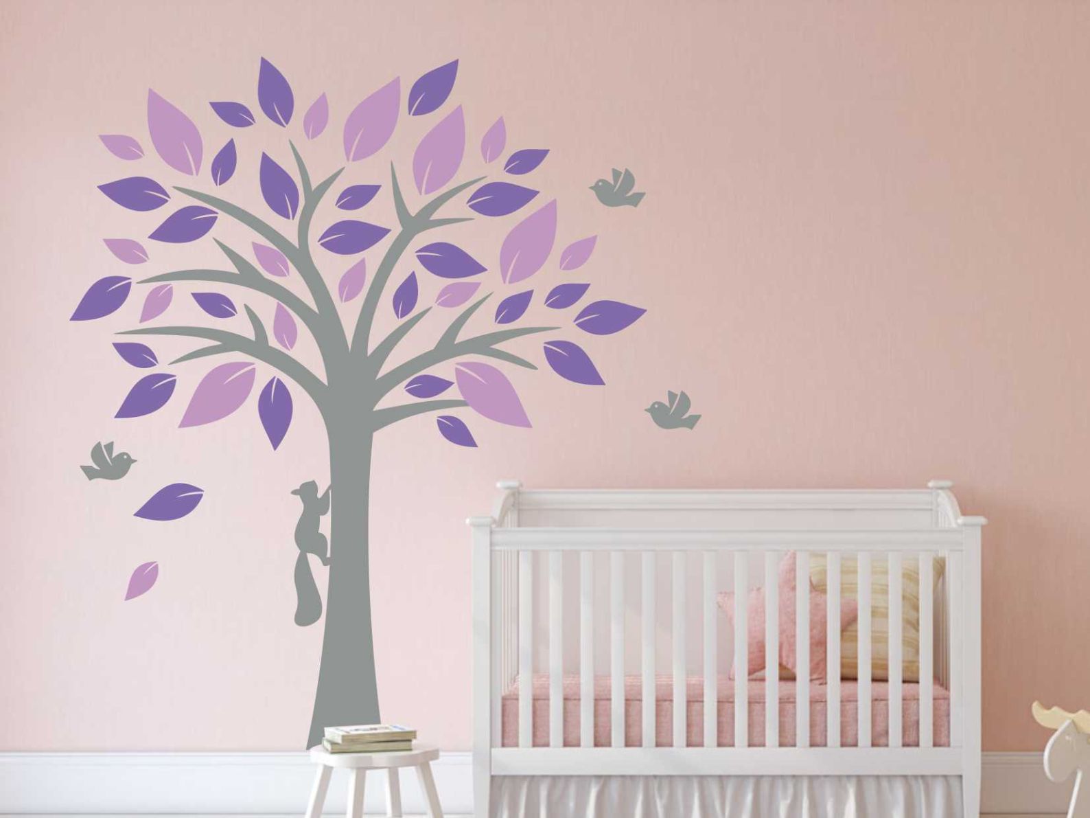 4. Дърво с 2 цвята листа катеричка и птици – дизайнерски стикер за декорация