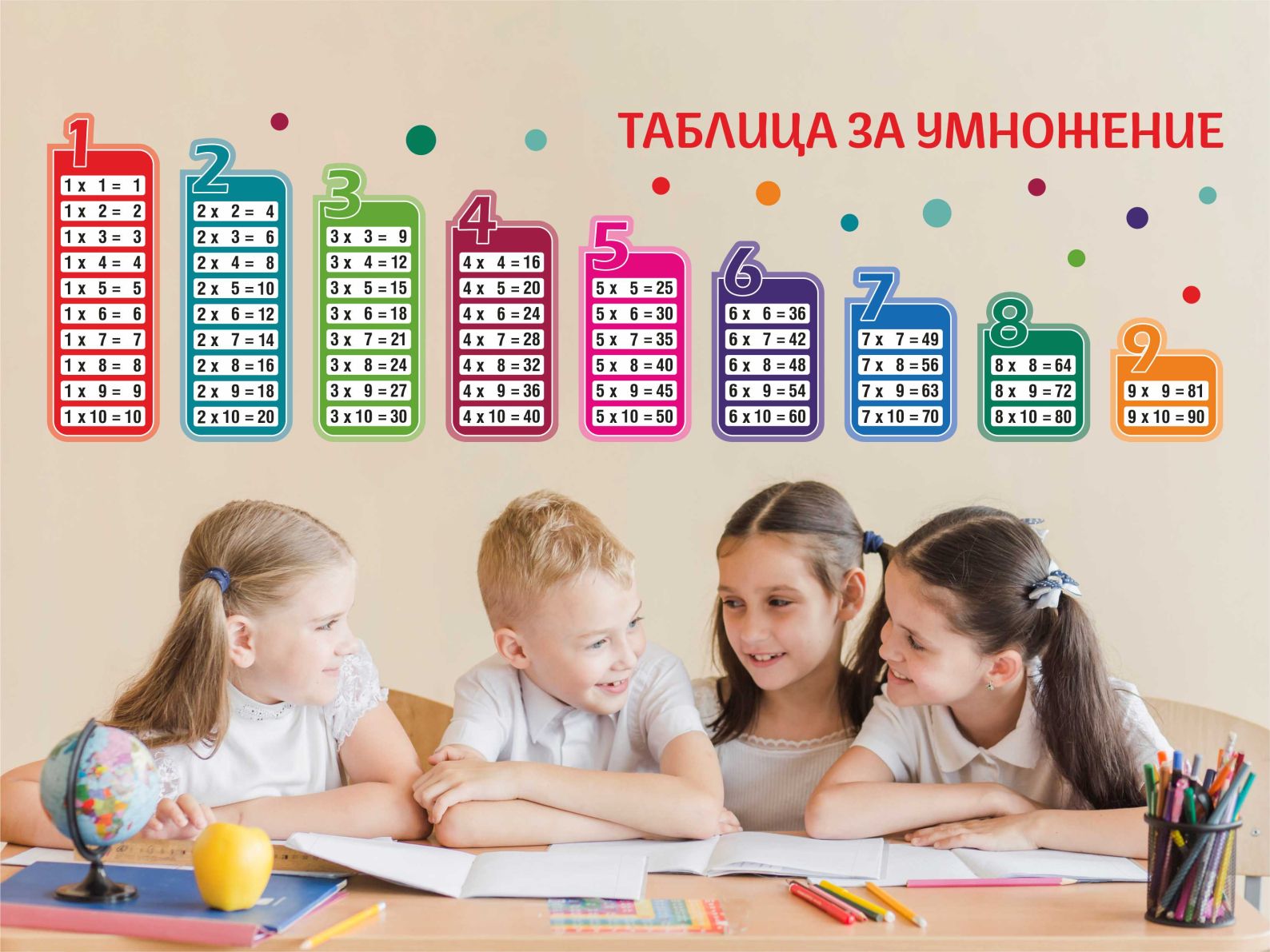 Специално разработен с атрактивна визия, която приковава вниманието на малките и по-големи ученици и развива въображението, творческите им заложби и иновативното мислене. Вижте го тук: Таблицата за умножение