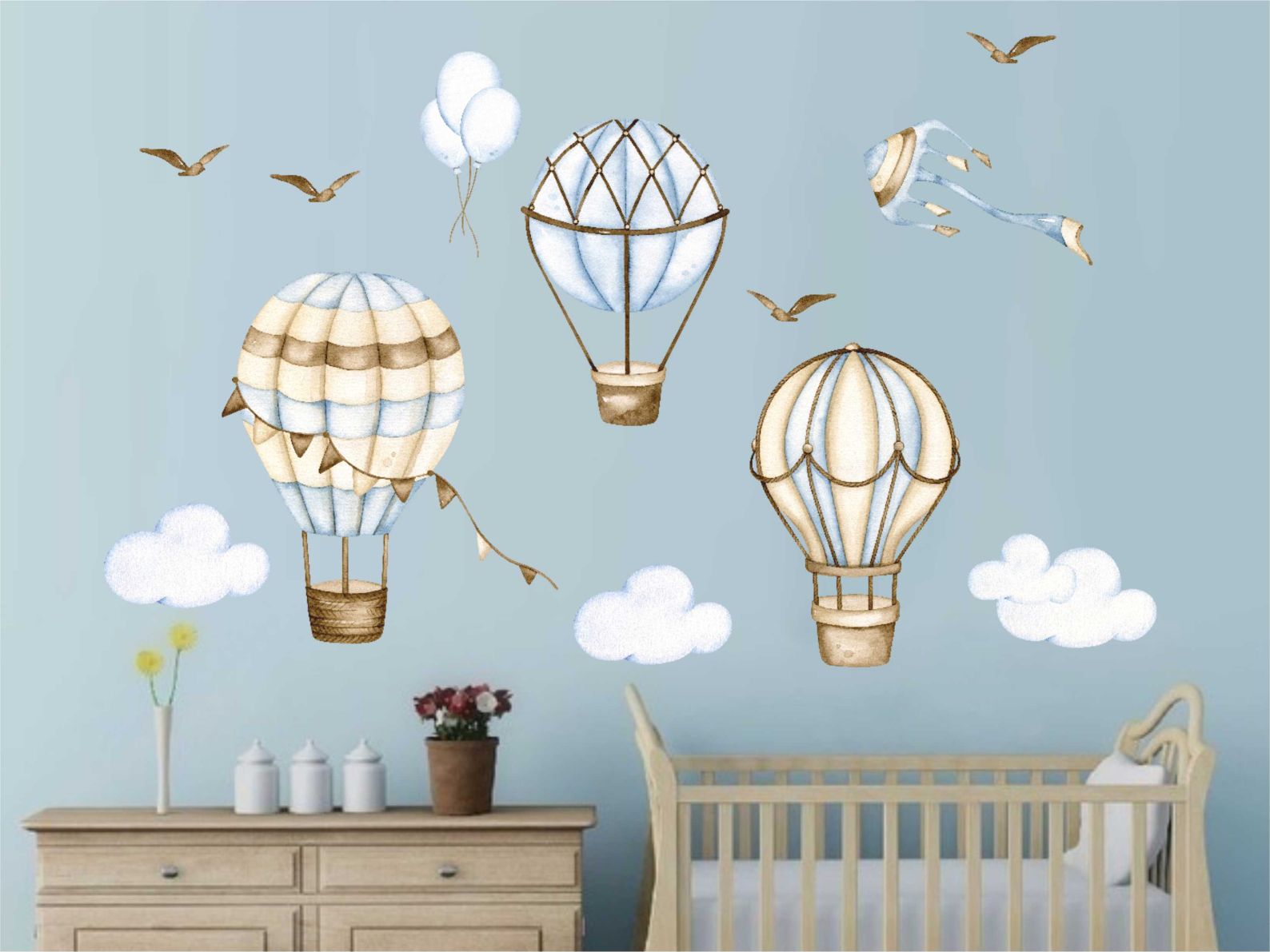 Залепете в детската стая този красив стикер-комплект с балони и нека въображението на вашето дете го отнесе на вълнуващо приключение в небе осяено с облаци и птици. Вижте го тук: Балони в синьо - стикер за стена с ефект на акварелна рисунка