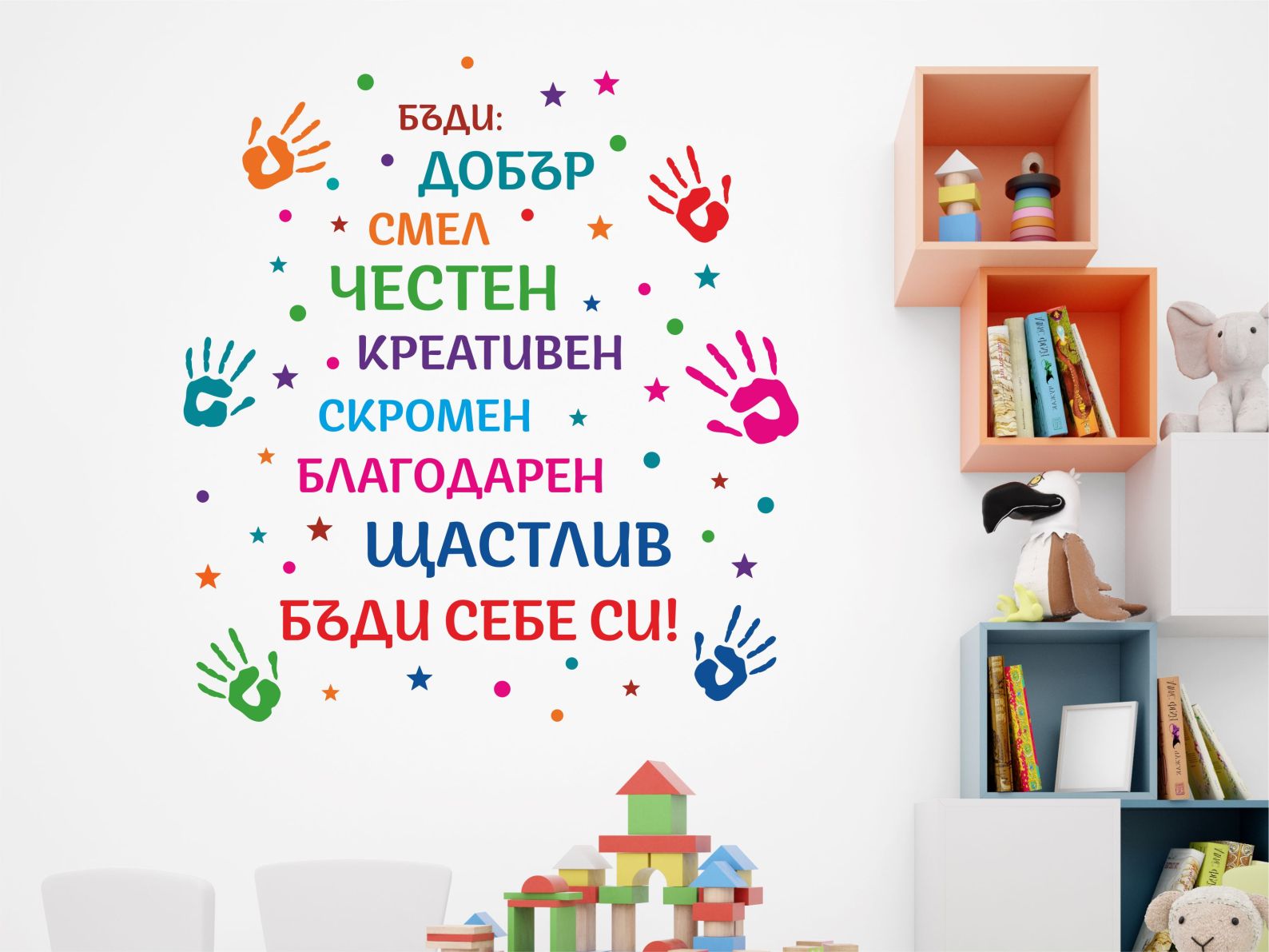Детската стая е много повече от място за сън и съхранение на играчки; това е място, където децата могат да дадат воля на въображението си, да експериментират с нови идеи и да създават спомени. Както казва Алберт Айнщайн: „Играта е най-висшата форма на изследване.“ Кътчето за игра е истинското сърце на дома за малките му обитатели! Независимо дали имате отделна стая за игра или място в дома, което сте отделили за детски игри и играчки, превърнете го в свежо пространство, като го украсите със нашите стикери за стена. От семпли точки до стикери с цитати, от красиви дизайни с феи, цветя и животни до стикери със звезди и планети, в нашата колекция от стикери за стена на deko.bg има по нещо за всеки.