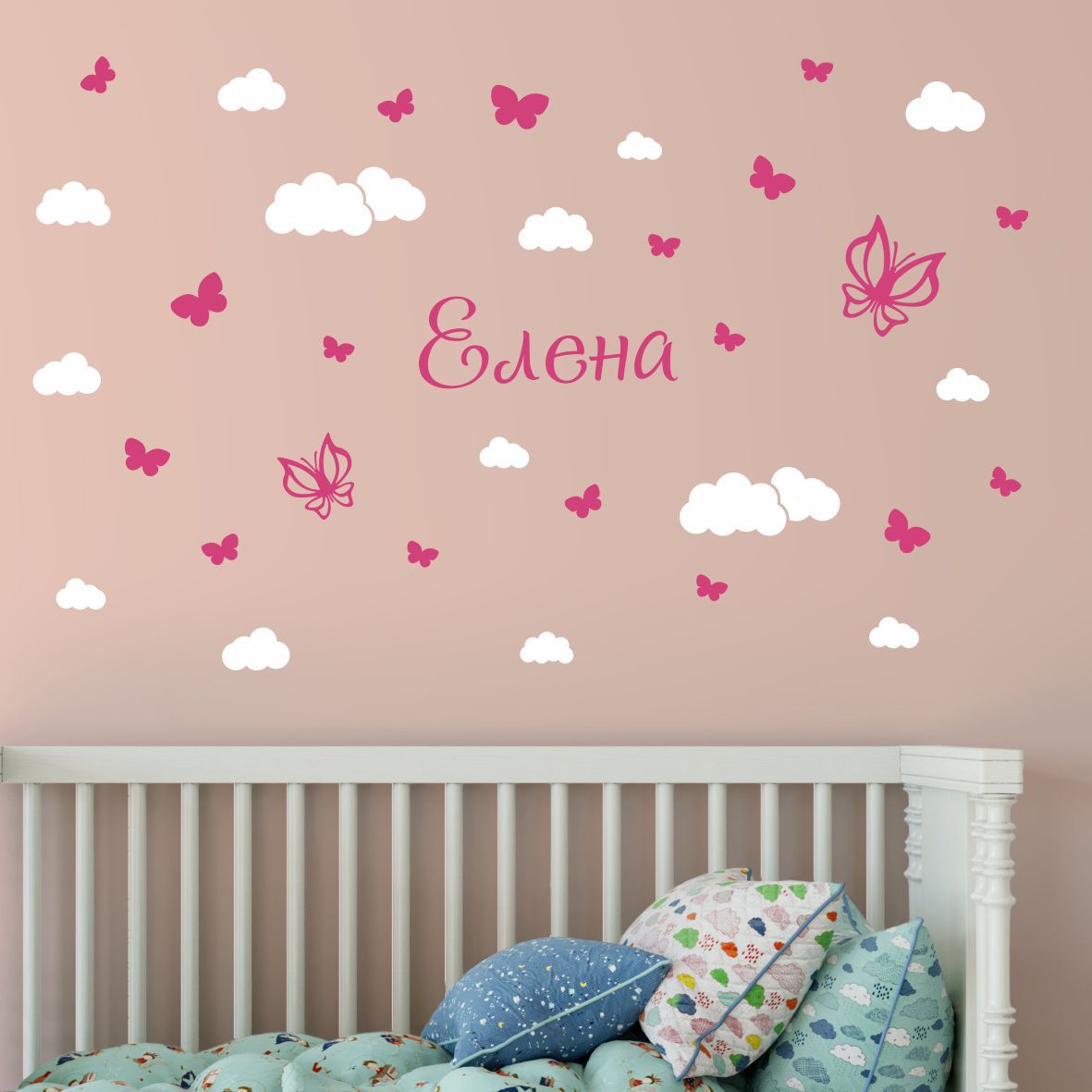 Стикер за декорация на стена в детска стая или детски кът за игра. Име на детето с красиви пеперуди и облачета