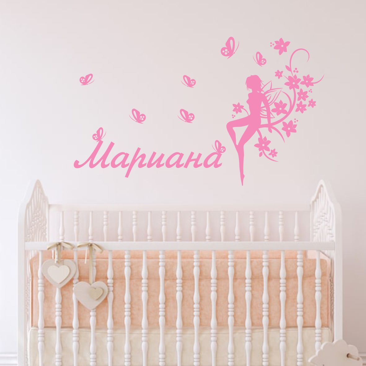 Стикер за декорация на стена в детска стая или детски кът за игра. Име на детето с красива горска фея и пеперуди.