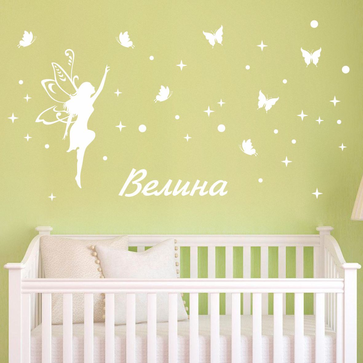 Стикер за декорация на стена в детска стая или детски кът за игра. Име на детето с красива фея, пеперуди, звезди и точки.