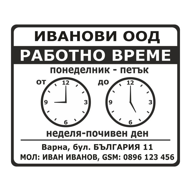 Стикер работно време изработен от висококачественно гланцово ПВЦ фолио издръжливо на външни условия