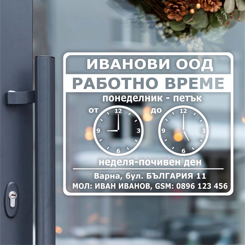 Ако желаете да залепите работното време от вътрешната страна на врата(прозорец), поръчайте го с огледална позиция!