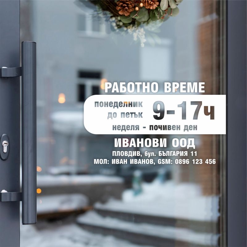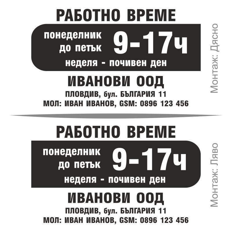 Ако желаете да залепите работното време от вътрешната страна на врата(прозорец), поръчайте го с огледална позиция!