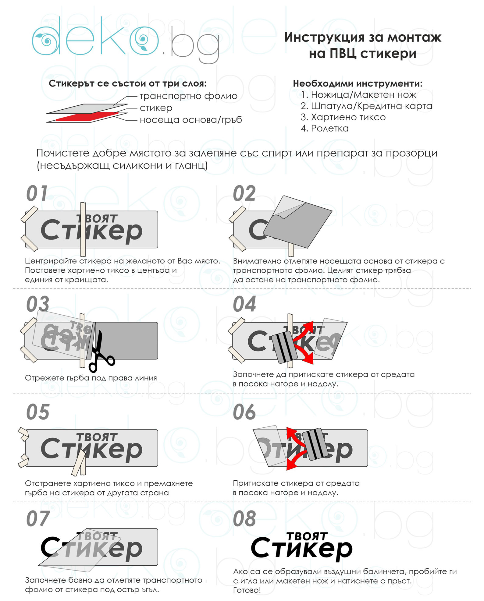 Имате възможност да закупите и шпатула за монтаж, която помага при поставянето на стикера (може да се използва и стара кредитна карта).