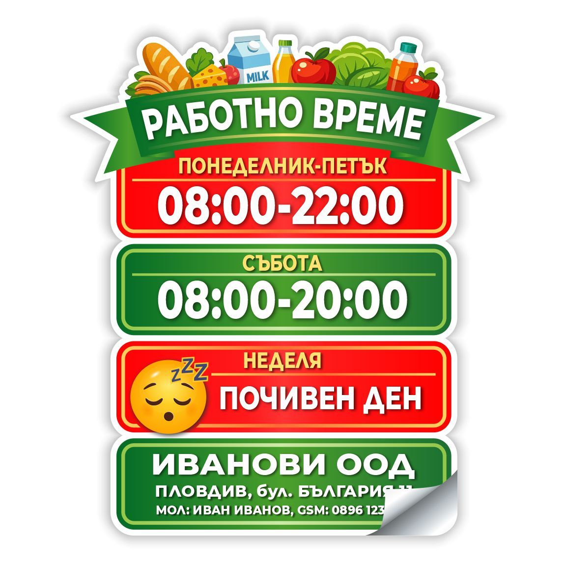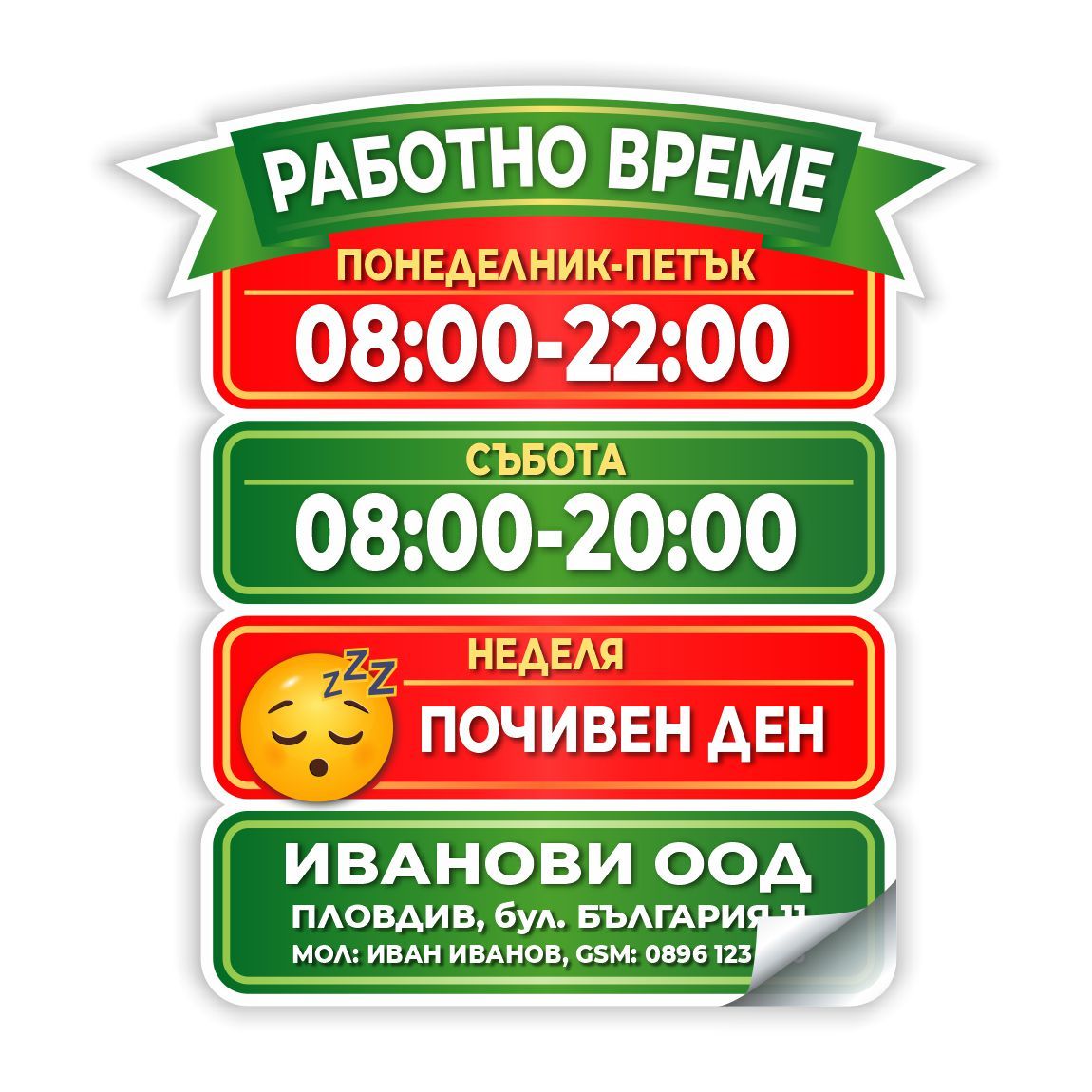 Стикер работно време изработен от висококачествено гланцово ПВЦ фолио издръжливо на външни условия