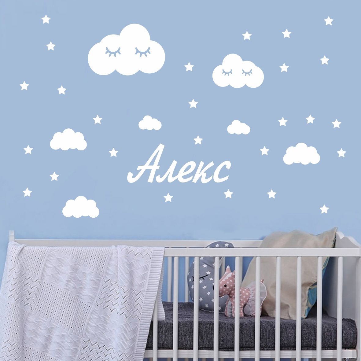 Стикер за декорация на детска стая с име на детето, симпатично мече, облаци и звездички. Весела и забавна декорация за стаята на вашето съкровище, подходящ както за момчета, така и за момичета.