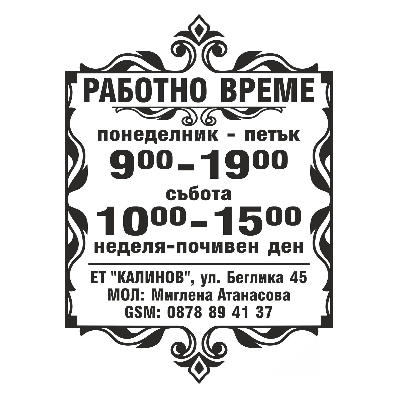 Стикер работно време изработен от висококачествено гланцово ПВЦ фолио издръжливо на външни условия