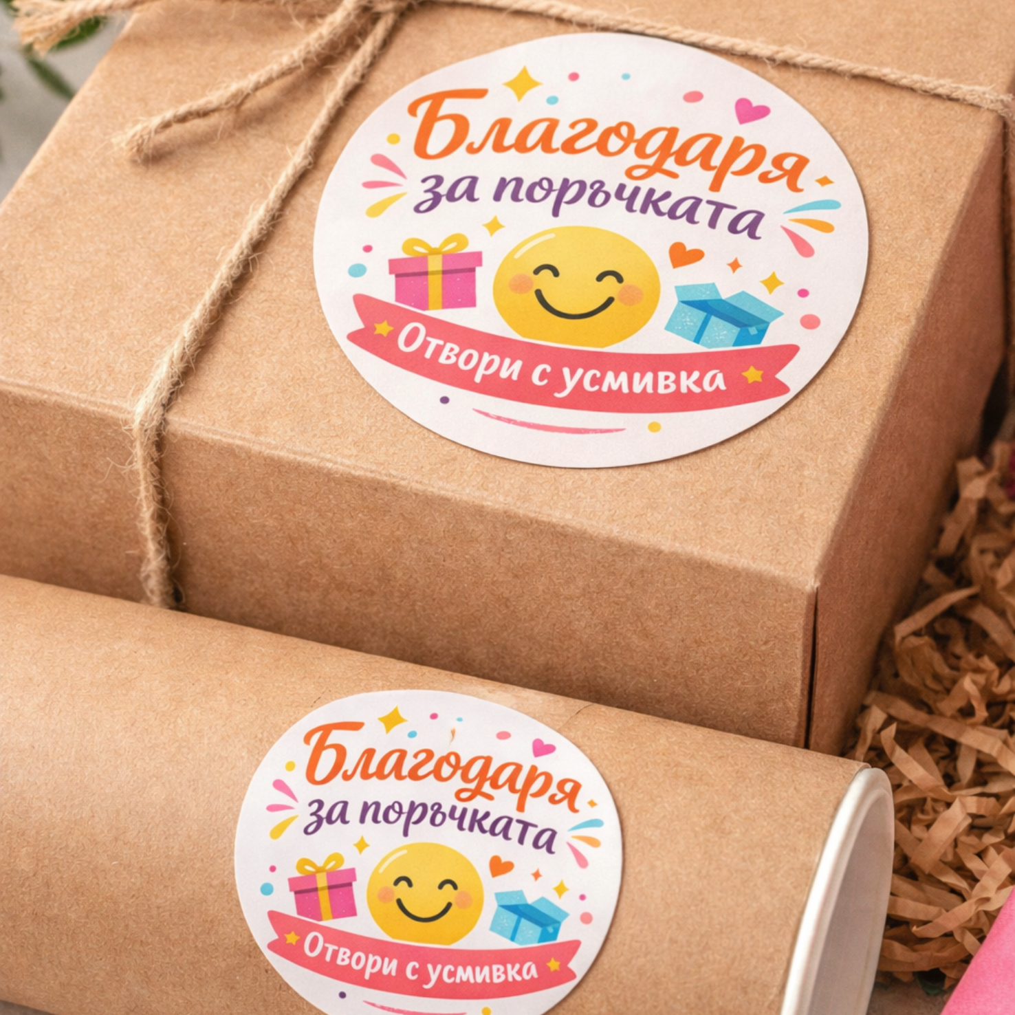 „Благодаря за поръчката“ и „Отвори с усмивка“, което прави всяка опаковка по-специална.