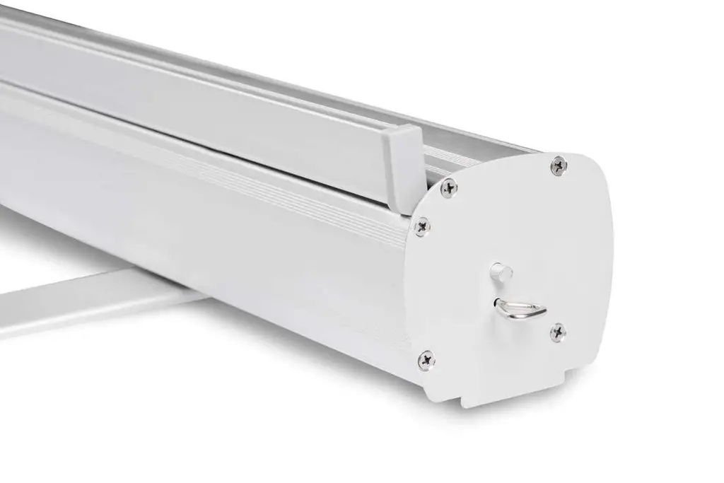 Системата разполага със здрав алуминиев корпус и самонавиващ механизъм, който съхранява рекламното платно защитено в основата. Само за секунди можете да разгънете банера и да го фиксирате чрез алуминиев стълб, без нужда от инструменти.